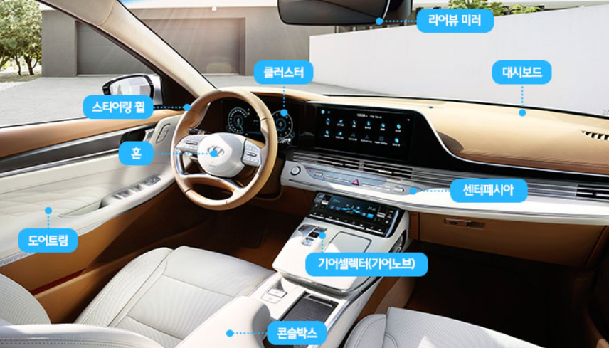 인테리어의 경우 많은 사람들에게 익숙한 부분일 것입니다. 운전자를 기준으로, 통상 핸들이라고 불리는 스티어링 휠이 앞에 있고, 그 뒤로 자동차의 전반적인 상태를 한 눈에 볼 수 있는 클러스터(계기판)이 있죠. 운전자와 조수석 사이에는 자동차 전반을 통제할 수 있는 버튼들이 정렬되어 있는 센터페시아가 있습니다. 앞 부분 전반을 대시보드라고 부릅니다. 두 좌석 사이를 지나가는 센터콘솔, 그리고 그 위에 콘솔박스라는 수납함이 있습니다. 승객이 앉을 수 있는 시트도 있죠.
