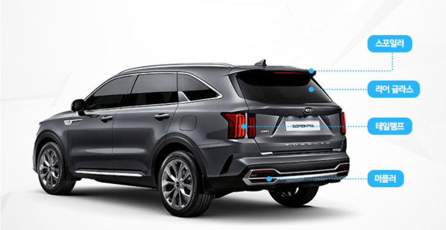 후면도 글라스 등의 유리, 테일램프라는 등화류 그리고 스포일러, 트렁크 커버 등으로 구성된다고 할 수 있습니다.
